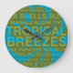 Words that mean summer: Tropical Breezes, Cool Blue and Tequila Sunrise combined with images of Monstera Leaves, Palm Trees, Hibiscus and create this graphic design.