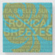 Words that mean summer: Tropical Breezes, Cool Blue and Tequila Sunrise combined with images of Monstera Leaves, Palm Trees, Hibiscus and create this graphic design.