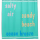 Turquoise blue green solid background. Salty air, Sandy beach, Ocean breeze typography in pastel pink, tan and blue typography. White geometric stripes. Designs by TamiraZDesigns.
