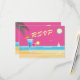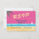 This colorful pink, summer wedding RSVP is accented with a bright sun, seagulls, blue water, and a couple of tropical drinks. The type gives this RSVP a retro feel, and keeps it fun and playful, making it perfect for the beach, Caribbean, Hawaiian, seaside, tropical or summer wedding.
