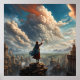 A lone figure stands atop a stone outcrop, gazing at the dramatic sky filled with towering clouds and a streak of fiery light. The vast, ancient city below, surrounded by mountains, adds a sense of scale and wonder. The figure's outstretched hand suggests a connection with the sky, perhaps invoking or commanding the forces of nature.