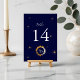 This table number card showcases a luxurious golden sun and silvery moon encircling the couple’s monogram, symbolizing harmony and unity. The deep navy background with subtle star accents adds a celestial charm, making it ideal for elegant, night sky-themed weddings. A perfect blend of style and functionality for your wedding reception.