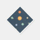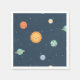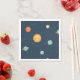 Space themed party supplies with doodles of the sun and planets over a dark blue backdrop decorated with little stars. Keep a look out for planet Earth that has clouds as eye brows. Colorful and cheerful pattern.