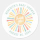 At the top of the sticker, "Mom's Name Baby Shower" is elegantly displayed in teal blue, and at the bottom, the baby shower date is also in teal blue for a coordinated and personalized touch. This design perfectly complements your sun-themed baby shower, adding a playful yet elegant element to your event.