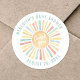 This round sticker design features a vibrant sun at the center, with the cheerful phrase "Thank You!" placed right on top of the sun. The sun's rays burst out in shades of yellow, orange, red, teal, and blue, bringing warmth and joy to your celebration.