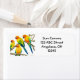 Original fine art design of colorful Sun Conure parrots by designer Carolyn McFann of Two Purring Cats Studio on customizable labels for parrot lovers.
