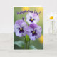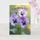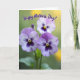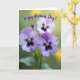 This card features three detailed flowers in the foreground, their petals fading from soft lavender into deep violet and edged with crisp white. Each bloom has a golden-yellow center with fine dark lines radiating outward, like delicate sunbursts that draw your eye in close. The close-up view and gentle outdoor light give the petals a velvety look, with soft shadows that add a tender, affectionate mood ❤️. Behind them, the background melts into a smooth blur of leafy greens and warm, sunlit yellows, creating a calm garden setting. Near the top, the message “Happy Mother’s Day!” is placed above the flowers in flowing lettering, set in a dark tone that stands out against the lighter backdrop. The spacing leaves the blooms as the main focus while the text floats neatly overhead, like a quiet note tucked into the sky. A few hints of green stems and soft yellow bokeh dots sit behind the trio of blossoms 🌼.