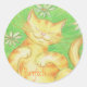 A happy, yellow tabby cat rolling around on the grass in the sunshine. Sticker with a yellow, orange, green, white and blue customizable design for you to personalise with your own text, pictures and ideas. An original coloured pencil drawing by Jess Perry.
