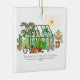 Square ornament has plants and greenhouse design on one side and says "it's not hoarding if it's plants" and a classic sun face with "Let the sunshine in." Designs by Rhonda Stewart.