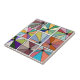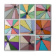 This ceramic tile has an abstract design that is made of nine squares with a circle and “rays” coming out of the circle in many different colors.