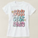 A pretty groovy style colorful typography saying for the summer vacation, that reads: Sun, salt, sand.