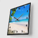 A clock with a lovely photograph. A white sandy beach with azure blue water. Relaxing image with a sunny sky and gentle foamy surf with some cute tropical leaves framing the image.