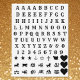 Cool, classic vintage script typography alphabets (uppercase A-Z letters), numbers (0-9), fun symbols (hearts, stars, anchor, cross, star of david), and the 12 sun signs, temporary knuckle tattoos.
