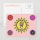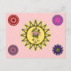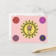 yelliow sun with triangular beams in the centre and within it a lovely yellow cross with large pink flower and green leaves entwined around it. on the four corners a four beautiful mandalas. one hot pink mandala. one purpke and green mandala. one purpkle and mauve mandala and one red and white mandala. pink background.