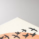 A flock of birds silhouetted in front of a reddish sun on a beige background.