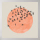 A flock of birds silhouetted in front of a reddish sun on a beige background.