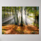 Sunbeams in a misty beech tree forest in autumn - poster