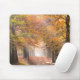 Mousepad with rays of light created by sunbeams through the fall foliage of the trees along a path through a forest in the morning fog in autumn.