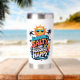 Front and center is the funky, feel-good quote, wrapped in sunny beach elements: a cool cartoon sun rocking shades, swaying palm trees, vintage surfboard, rolling ocean waves, and cheerful tropical accents like starfish and hibiscus blooms. It’s a whole summer mood — radiating happiness, heat, and high tides.