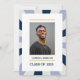 This graduation card announcement features a sunburst background in navy periwinkle and white colors with a room for a vertical photo framed by a white frame.Personalize the card adding your photo, name and year.