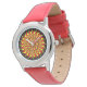 A very bright and colorful design. A stylized sun with a spiral center and in flaming colors fills the entire watch face. No numbers are on the face. Due to the design of the hands, the Stainless Steel version might be a bit more difficult to read than the other styles.