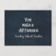 We love the design on the postcard. The card was a nice thickness. I recommend Matt over Semi-gloss for this design. It also lets you add text to the back. With a 50% promotion, this was very reasonable. In addition, you save on the cost of the envelope and postage for postcards. The print was beautiful. I recommend matt finish for this design