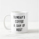Start your Sunday with a moment of peace and a sip from this witty coffee mug! Perfect for coffee lovers who cherish their day of rest. Features the motivational quote "Sunday's Coffee, A Day of Rest" in sleek black typography on a clean background. Made with high-quality ceramic that keeps your coffee at the perfect temperature. Available in 11oz and 15oz sizes to enjoy your weekend relaxation. Makes a perfect gift for coworkers, friends, or any coffee enthusiast who appreciates weekend humor. Dishwasher and microwave safe.