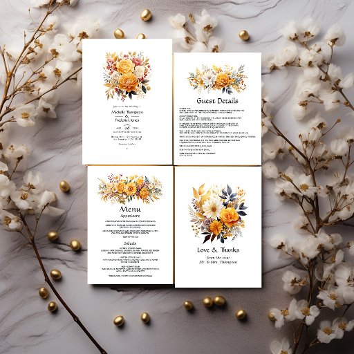 Sundial/powdered gold floral wedding menu featuring navy, a wisp of yellow and spun gold. Ideal for a garden wedding.