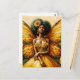 This postcard features a dark brown-skinned fairy with an afro and large butterfly wings. An African diaspora sunflower fairy painting by Dee Claire. The fantasy creature wears a yellow dress, adding to the bright, sunny, summery aesthetic. She strikes a confident pose. Great for fans of diverse fae folk.