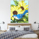 Bird art in an illustrative style of blue jay perched among sunflowers