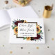 Design features elegant watercolor roses, peonies, wildflowers and sunflowers in various shades of burgundy red, navy blue and more over a wreath of eucalyptus greenery. Design also features a barn wood frame underneath the wreath. A unique font layout compliments the overall design. You can change the background color on the front and back to the color of your choice or leave both set to white. View the collection on this page to find matching wedding stationery products.