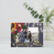 Rustic winter photo wedding save the date postcard with yellow gold sunflowers and dark red burgundy roses bouquet, strings of white twinkle lights and gold typography script on a dark midnight navy blue elegant chalkboard. +++++++++ Easy to personalize with your names and text! ++++++++++ Suitable also for floral summer or autumn fall / garden backyard rustic country or farmhouse themed weddings.
