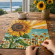 This sunflower art design captures the warmth of late summer with a bold golden bloom rising above a coastal horizon of rolling blue waves and sunlit skies. Rich texture and painterly detail give this floral landscape a timeless, storybook feel—bright yet serene. Perfect for relaxing afternoons at the table, family gatherings, or gifting to garden lovers and art enthusiasts, it brings a touch of sunshine and coastal calm into any space.