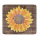 This rustic chopping board is decorated with a yellow watercolor sunflower on a barn wood background.