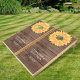 This rustic Wedding Cornhole Set is decorated with yellow watercolor sunflowers on a brown barn wood background