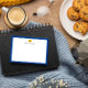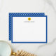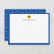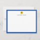 Personalized note card with a blue border and a small sunflower head. Customize with your name. The back of the flat note cards features a blue and white polka dot pattern. Sunflower notecard personalized with your name. Blue personalized notecard with your name and a sunflower.