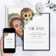 Create the perfect wedding Save the Date card with this pretty, modern design featuring a watercolor sunflower navy blue floral motif, and hand lettered script typography. Contact designer for matching products. Copyright Elegant Invites, all rights reserved.