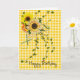 sunflower bouquet with ivy and lady bugs on yellow gingham background