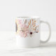 This coffee mug features a watercolor style illustration of a sunflower bouquet in yellow, pink and brown. Your name or other personalized text is spelled out below in elegant dark brown script. Use the template field to enter your own name or other message.