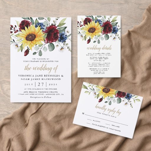 Sunflower Burgundy Roses Navy Blue Wedding InvitesDesigned by Jayme Lee