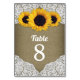 Sunflower Burlap Lace Wedding Table Number Cards - features a printed burlap background with alencon lace and a floral sunflower design to fit your country, vintage or rustic themed event.