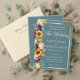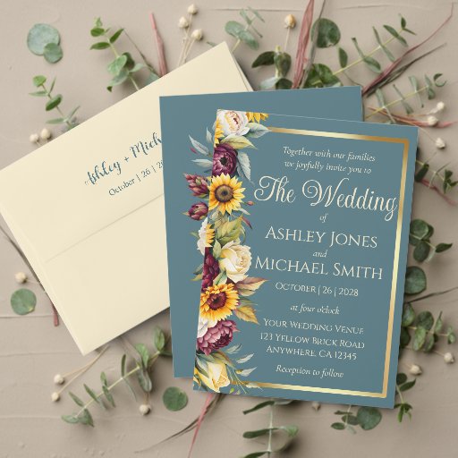 This elegant all-in-one wedding invitation design features a stunning watercolor design of sunflowers, roses, and peonies lining one side. The vibrant florals are complemented by a sophisticated gold frame that borders the reply card, adding a touch of luxury. This beautiful blend of colors and elegance makes it the perfect choice for a fall wedding, capturing the essence of the season with grace and charm.