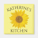 A close-up photograph of a single bright yellow sunflower and templates for first name and the word "kitchen" on light yellow background.