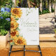 Watercolor yellow sunflowers elegant rustic modern spring summer fall garden baby in bloom baby shower welcome sign foam board with flowers and greenery foliage on a clear white background.