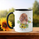 "LOVE MY DOXIE DOG" declares this mug for the Dachshund Dog owner. Each side of the mug has a beautiful watercolor portrait of a little red Doxie framed by sunflower blossoms and green leaves. Mixed in are sprigs of blue green eucalyptus. Between the two images is the text, which may be easily customized, or even removed, by you.
