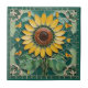 "yellow sunflower flowers", "sunflowers", "teal blue green turquoise, "gaudi style mosaic art", "van gogh inspired design", "hot summer heat garden", "decorative flower head", "ornamental floral ceramic tile", "dark green"