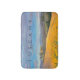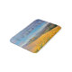 This unique bath mat features a print from an original oil painting by artist Leah Wiedemer called "Follow the Sun". Bright yellow sunflowers grab your attention in the foreground, leading your eye to the light on a Tuscan farmhouse and rolling farmland in the mid ground. Blue mountains are in the distance under a dramatic sky. The predominant colors are yellow and blue.