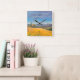 This modern wall clock features a print of an original oil painting entitled "Follow the Sun" by artist Leah Wiedemer. The image is of a bright yellow field of sunflowers, with a Tuscan farmhouse in the midground. Rolling hills are subtle shades of blue and violet and green, leading to distant mountains.
