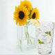 Design features sunflowers and botanical leaves over a printed gold colored geometric frame.