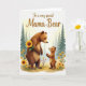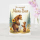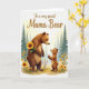 Designed with a cozy woodland scene, the illustration centers on an adult bear at the left leaning toward a smaller bear on the right, their gentle eye contact suggesting a close, affectionate bond ❤️. The adult bear holds a large sunflower with bright yellow petals that stands out against warm brown fur, like a quiet gift being offered. Soft golden light spreads across the scene, giving the clearing a calm, late-afternoon glow. In the background, pale yellow and fresh green tones blend into a simple forest setting with muted evergreen shapes framing the open space. Across the top, the message “To a very special Mama Bear” appears in flowing dark lettering, placed above the bears so it feels like it’s spoken over them. Along the lower area, small sunflowers and scattered wildflowers add cheerful color and a gentle, caring mood 🌼. The foreground shows clusters of yellow blooms and tiny multicolored flowers stretching along the bottom edge beneath the bears.